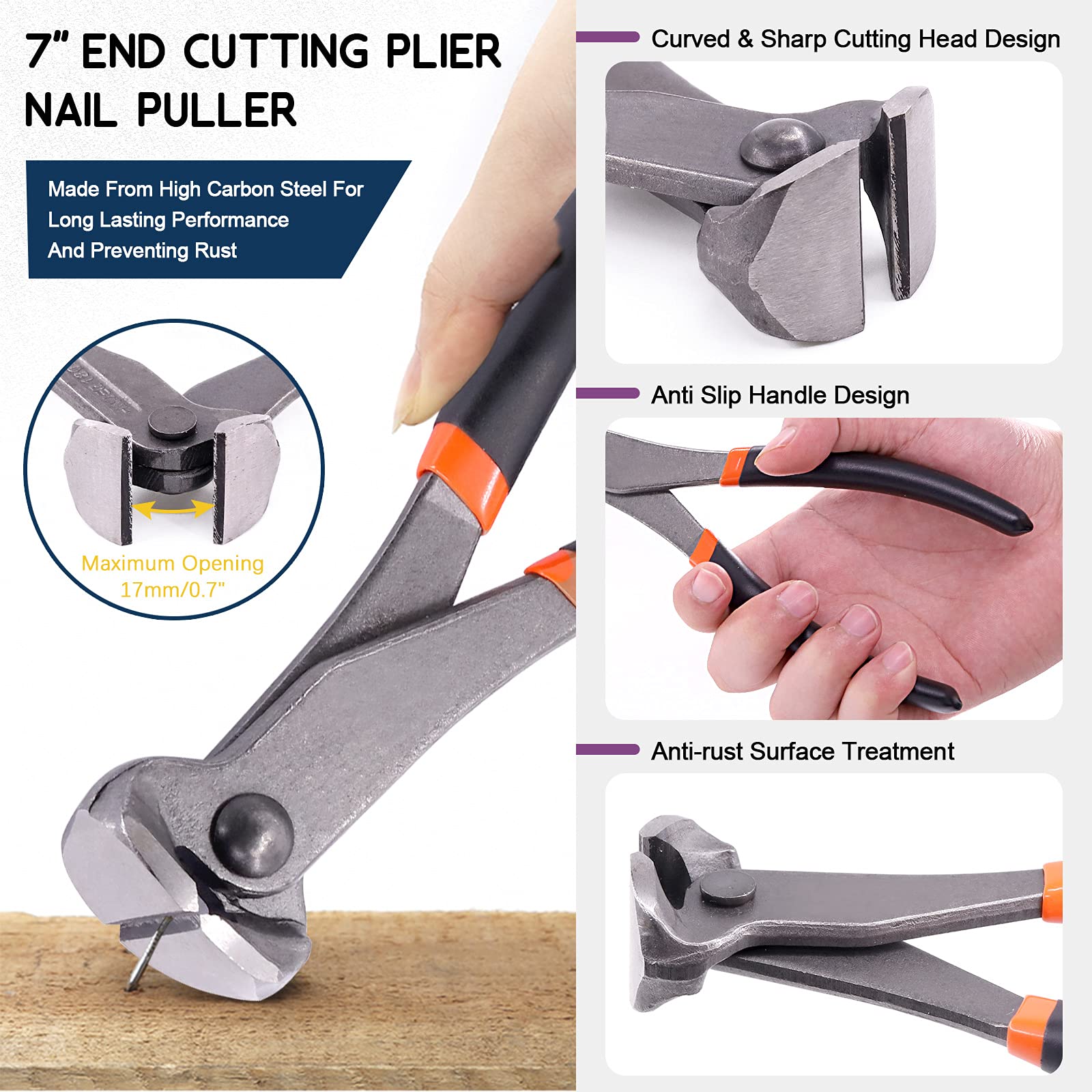 7Inch Nail Puller, End Cutting Pliers, End Cutters Nipper, Staple Pliers Nail Puller Nail puller at both ends to remove embedded screws and nails. The nail pulling tool by bates is currently one of the best options that you can opt for in this category. It is a 7” nail removing tool that comes with a plier/jaw design, making it a very convenient option. Both nail puller claws are precise and sharp. 4/5. Pliers Nail Puller.